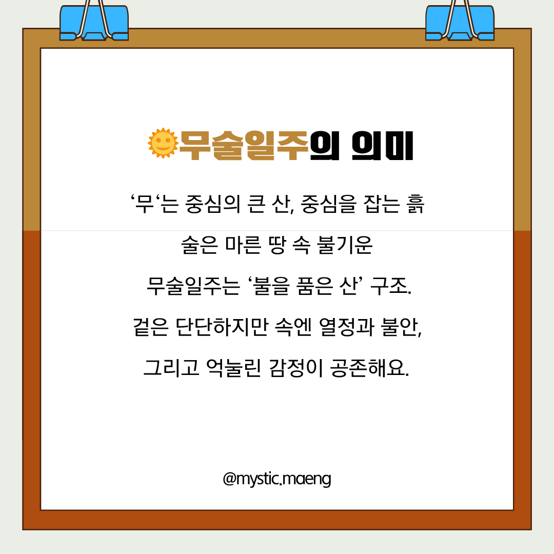 - '무(戊)'는 중심의 큰 산, 중심을 잡는 흙