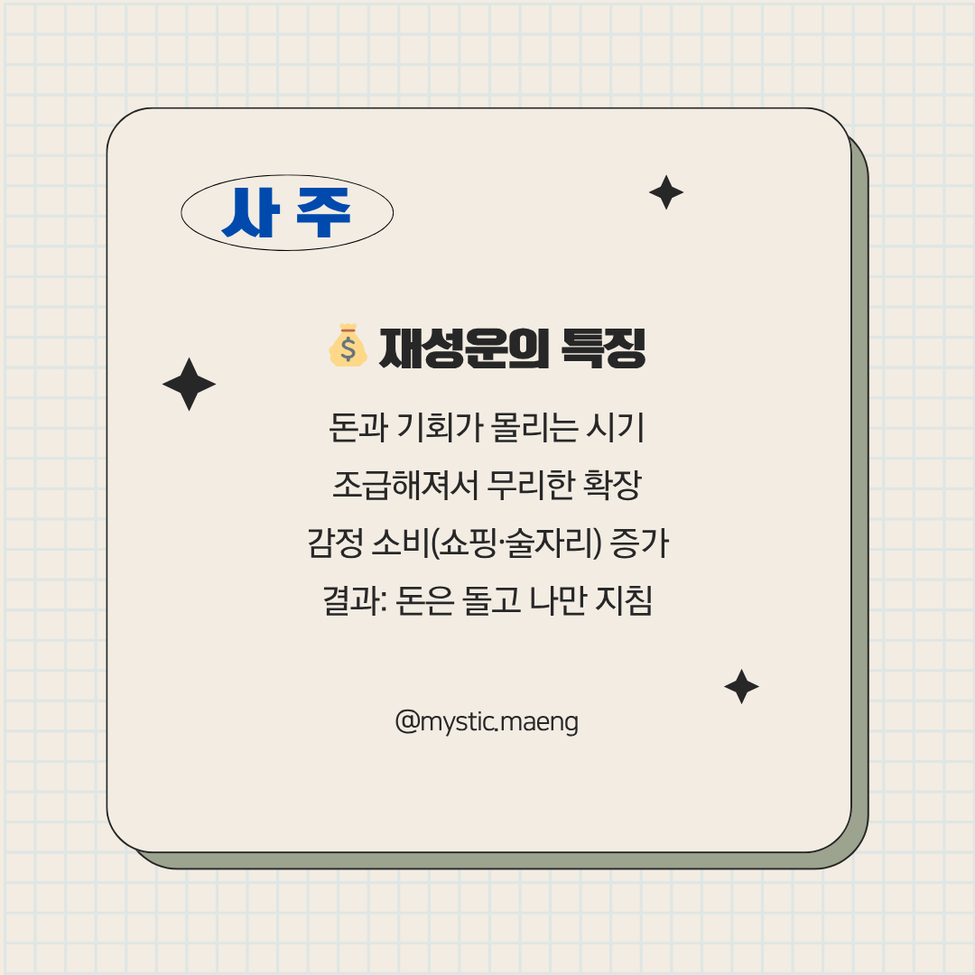 | 💰 [사주] 재성운 왔다고 다 돈 들어오진 않아요– 재성운 시기, 진짜 주의할 점 5가지 (0) | 2025.07.18 |