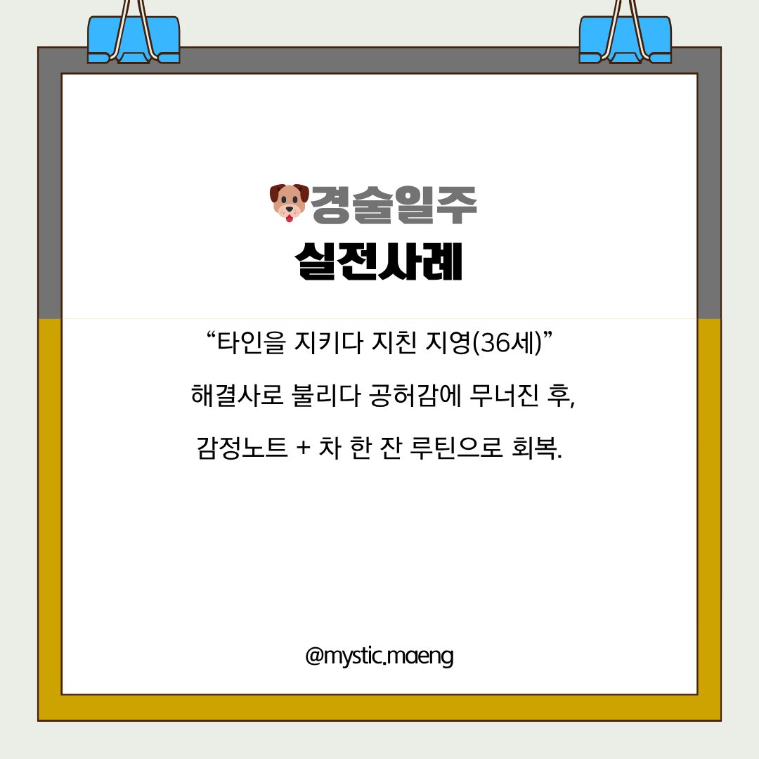 그 후 지영은 하루 10분 ‘감정노트’를 쓰고, 퇴근 후엔 “내 감정 3가지만 확인” 루틴을 시작했다.