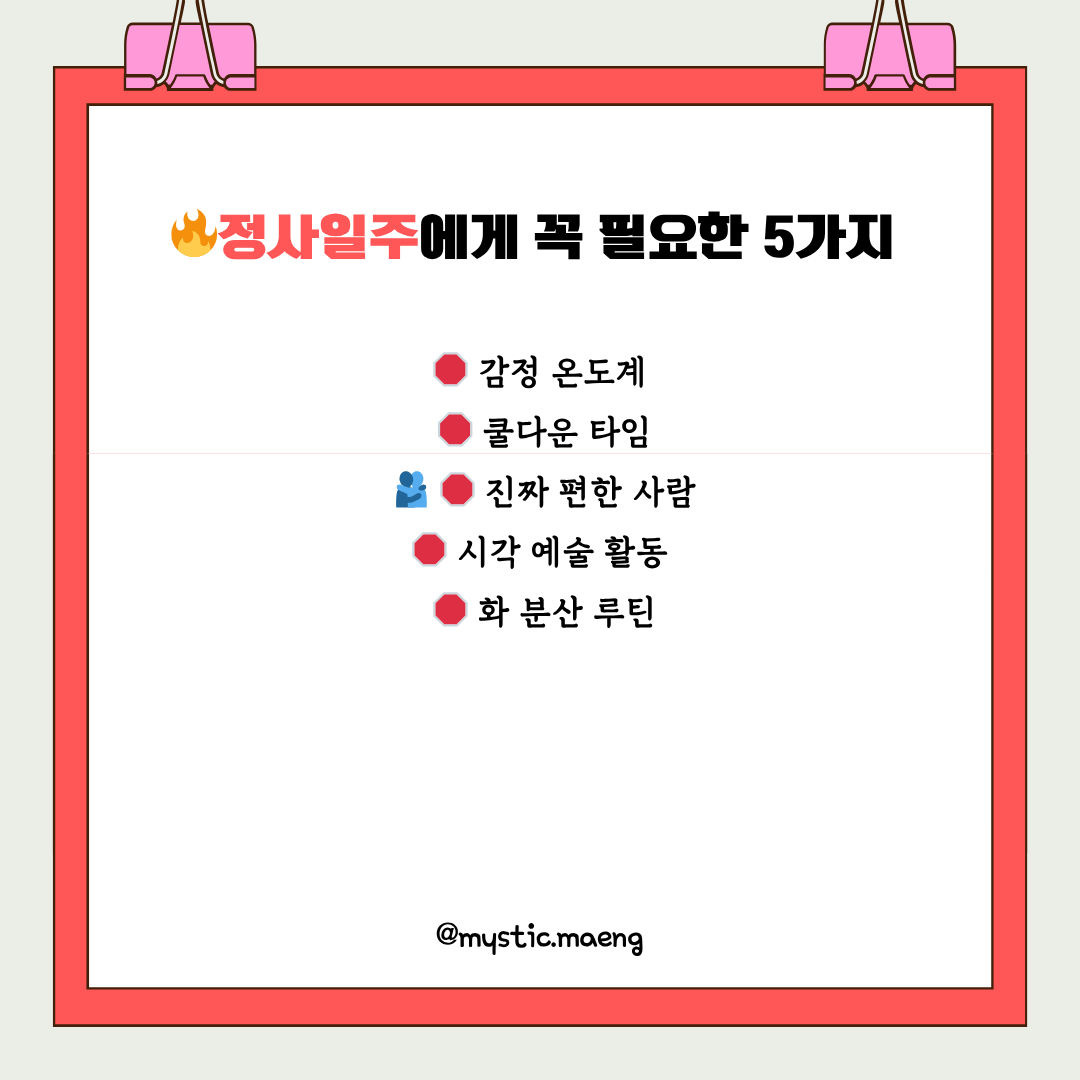 - 창작 활동 or 음악 듣기 등 내면 불꽃을 안전하게 태우는 루틴 필수