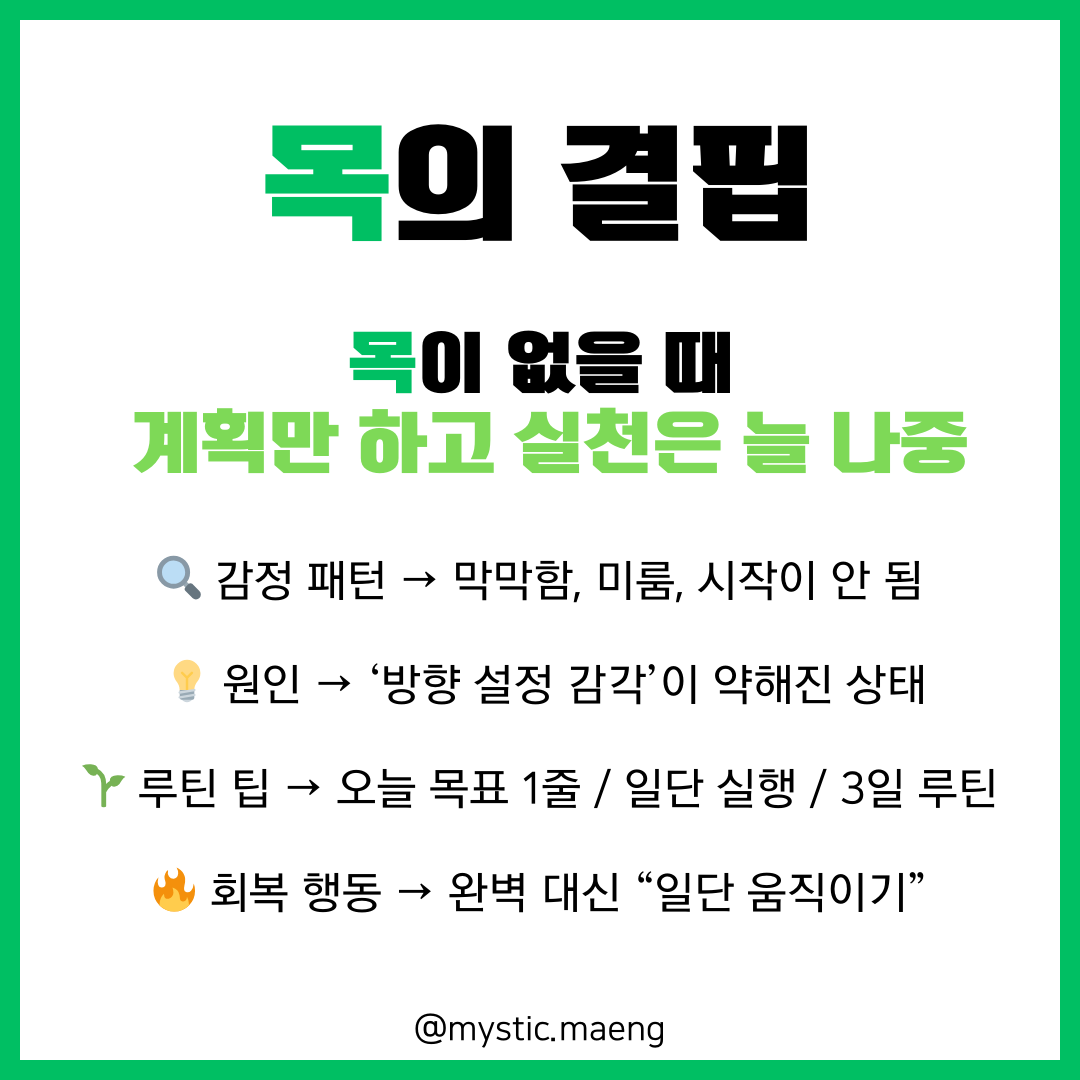 - 감정 패턴: 막막함, 미룸, 방향 없음