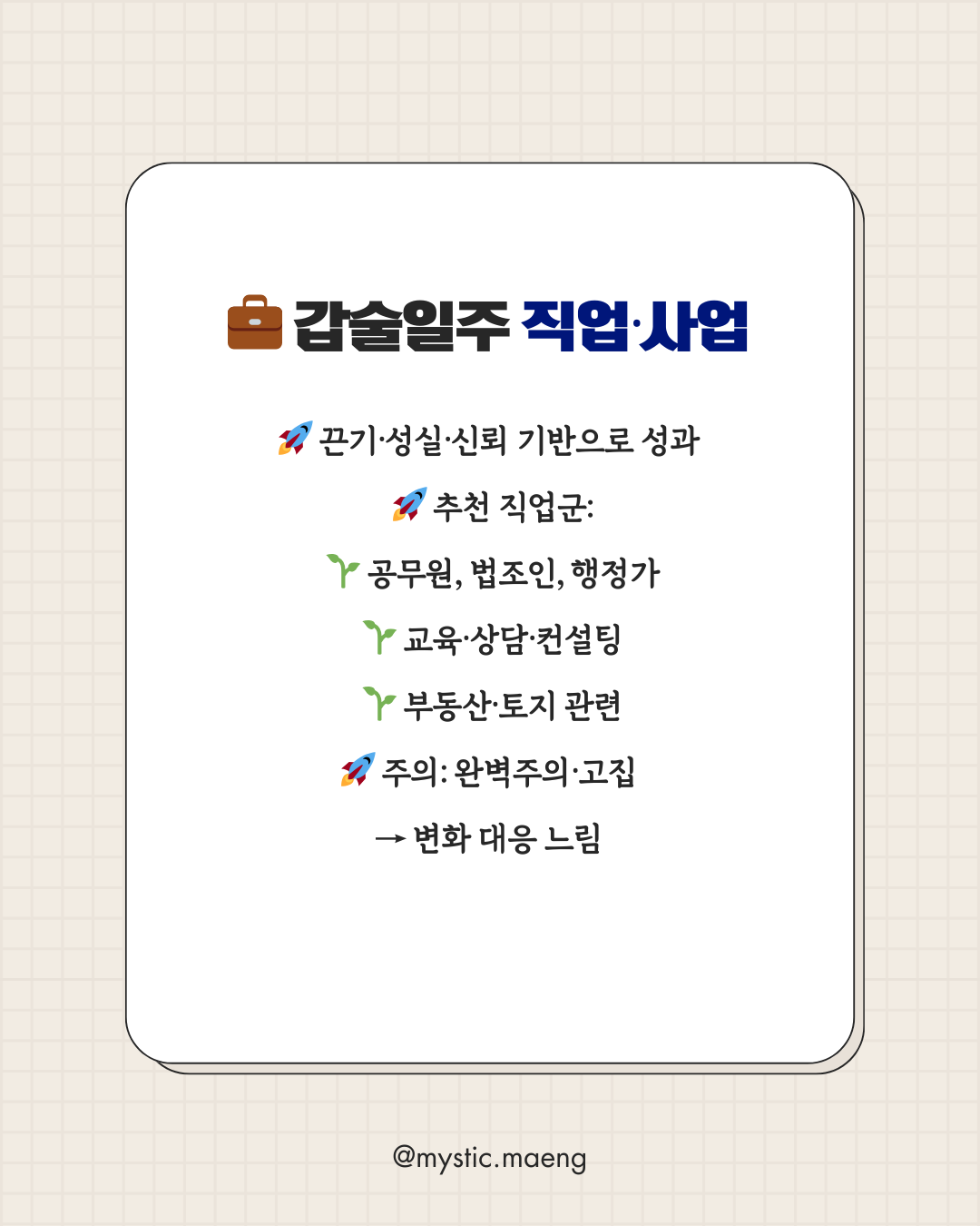 💡 핵심 팁: 갑술일주는 “투자보다 저축·안정 자산 관리”에 강점이 있습니다. 꾸준함이 곧 재산이 되는 타입이에요.