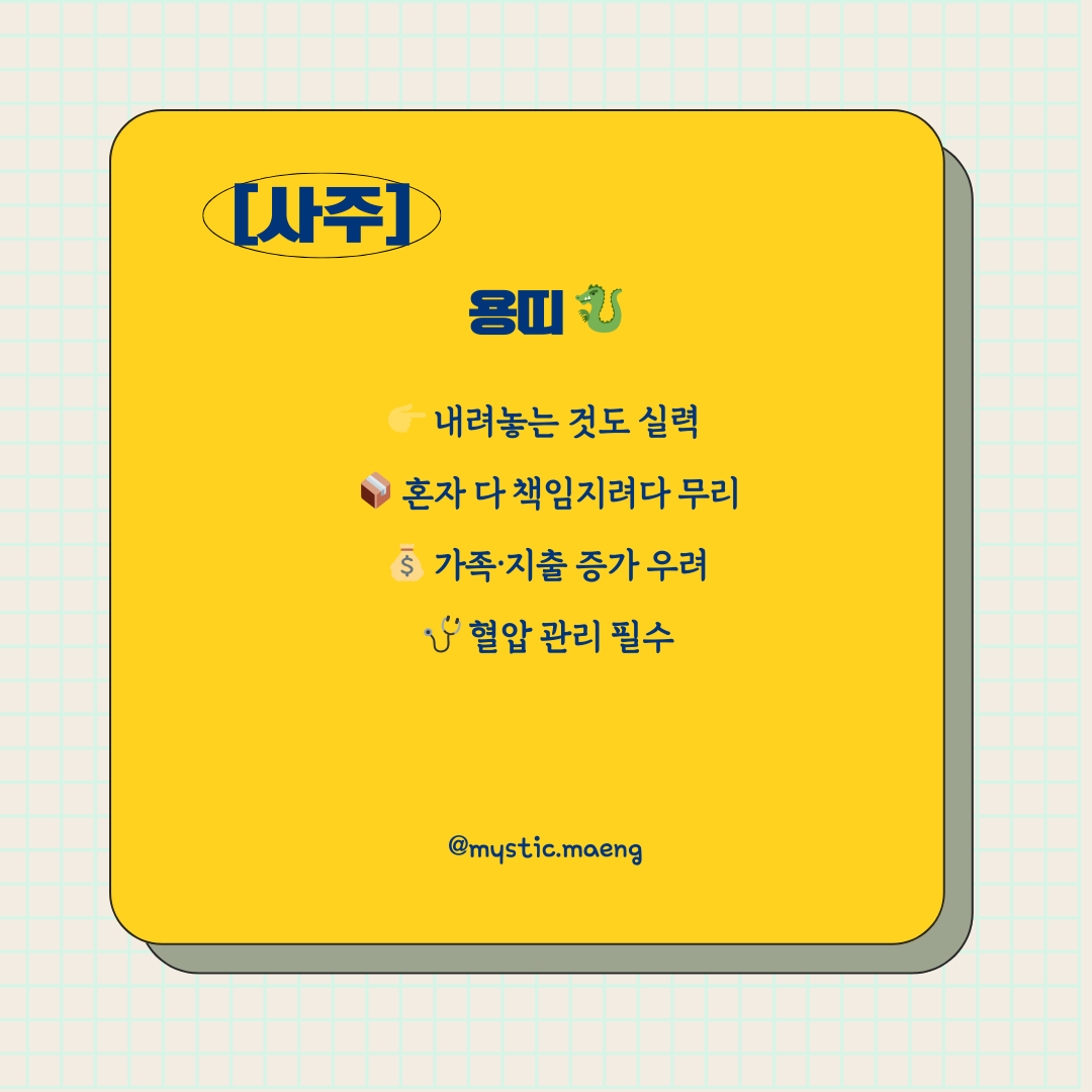 - 용띠 → 혼자 다 짊어지려다 지출과 건강 악화