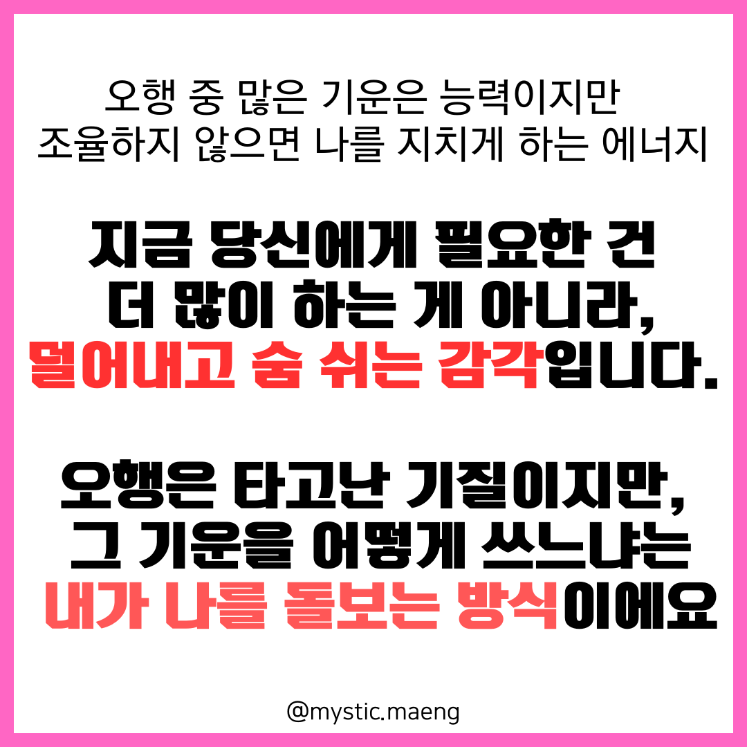 기운이 많다는 건 강점이자, 조율해야 할 숙제이기도 해요. 그 기운을 잘 다듬으면,