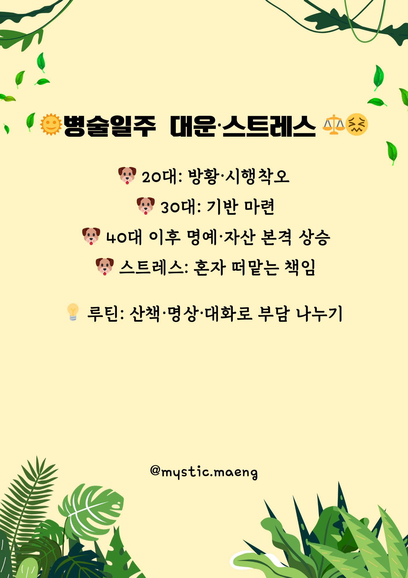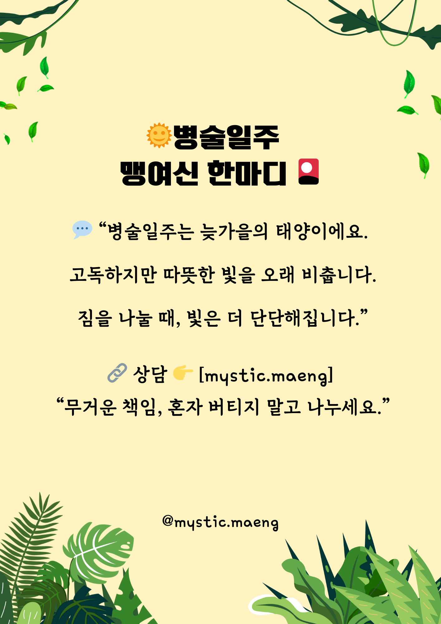 💡 루틴 팁: 책임을 나눌수록 삶은 훨씬 가벼워집니다. 짐을 함께할 때 병술일주는 빛나는 리더가 됩니다.
