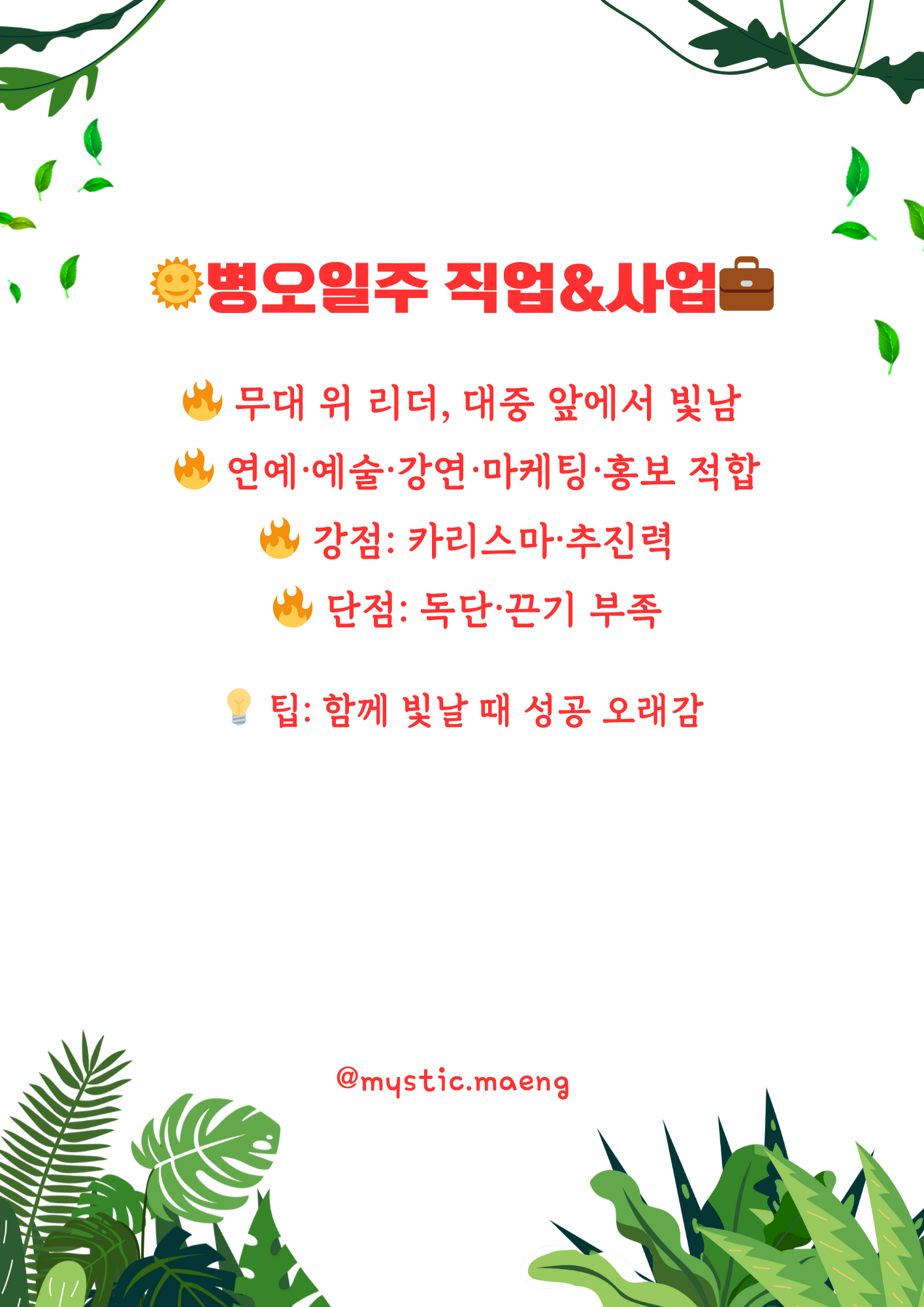 💡 직업 팁: 병오일주는 “혼자 빛나는 별”이 아니라 “함께 비추는 태양”을 목표로 할 때 더 큰 성공을 이룹니다.
