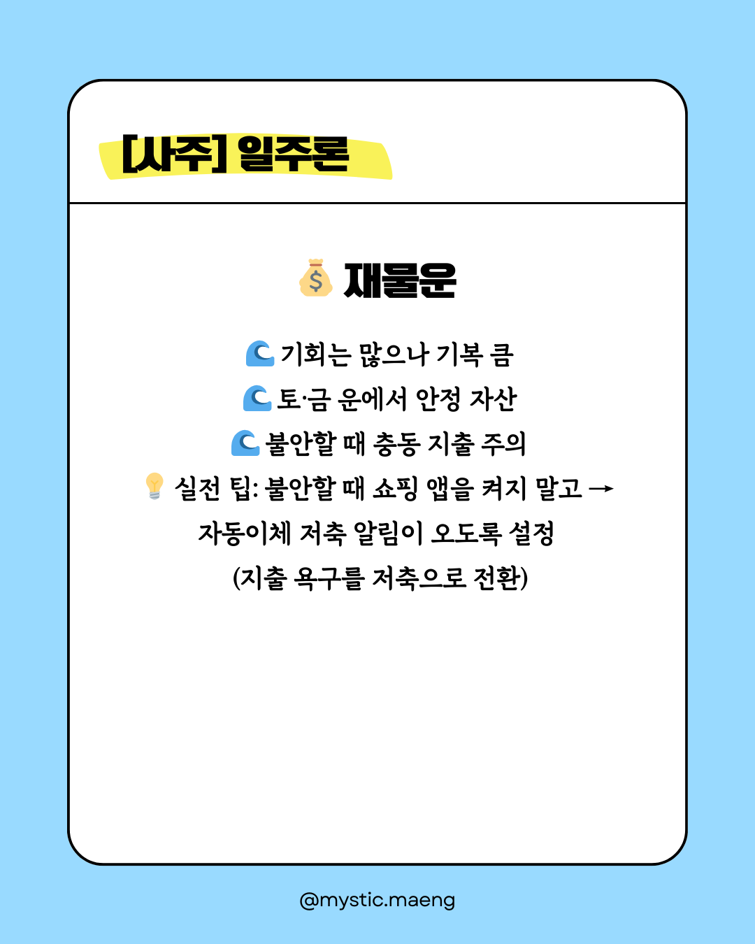 💡 재물 팁: 정해일주는 “흐름”을 타는 게 관건입니다.