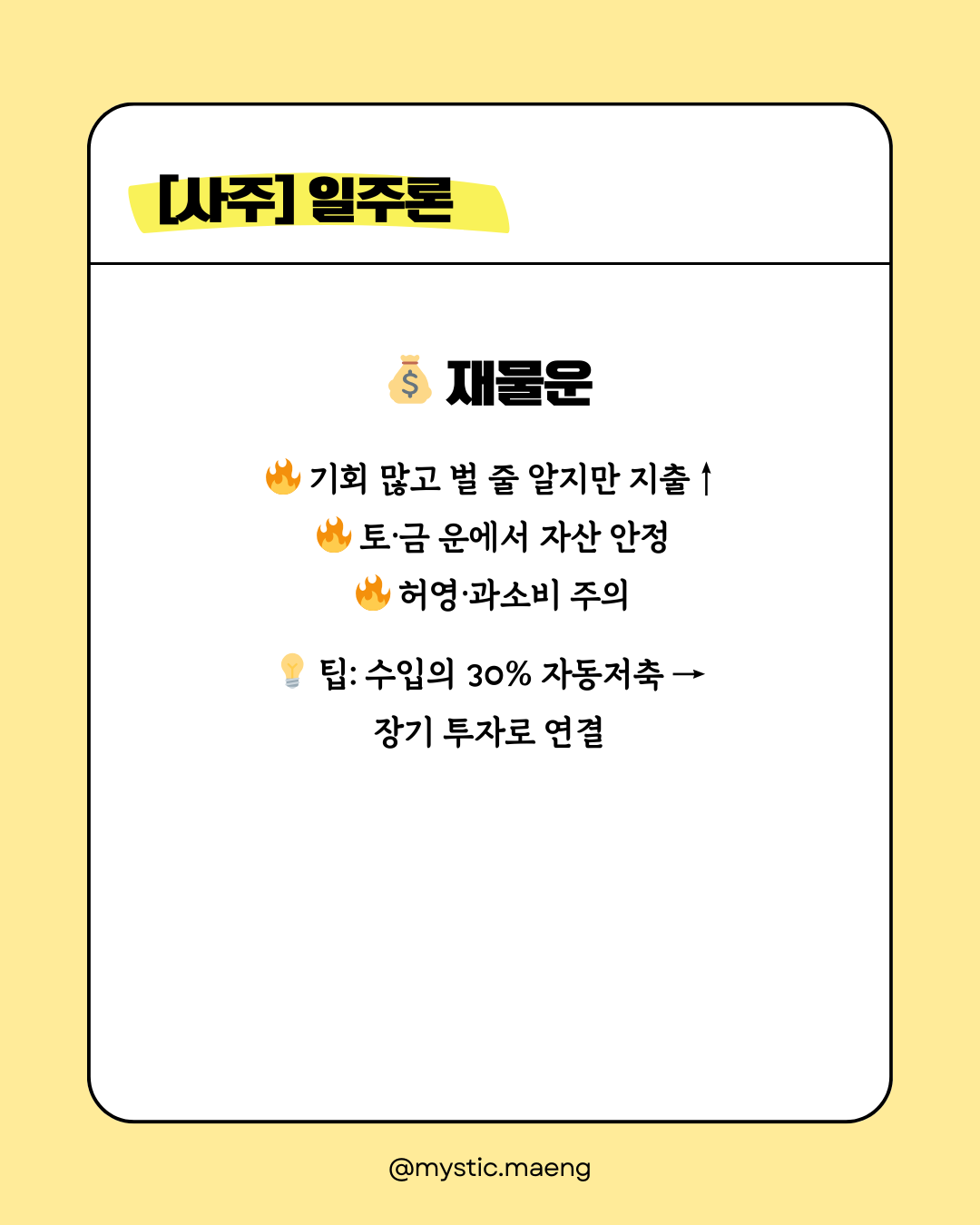 💡 재물 팁: 정미일주는 “벌기보다 지키기”가 관건입니다.
