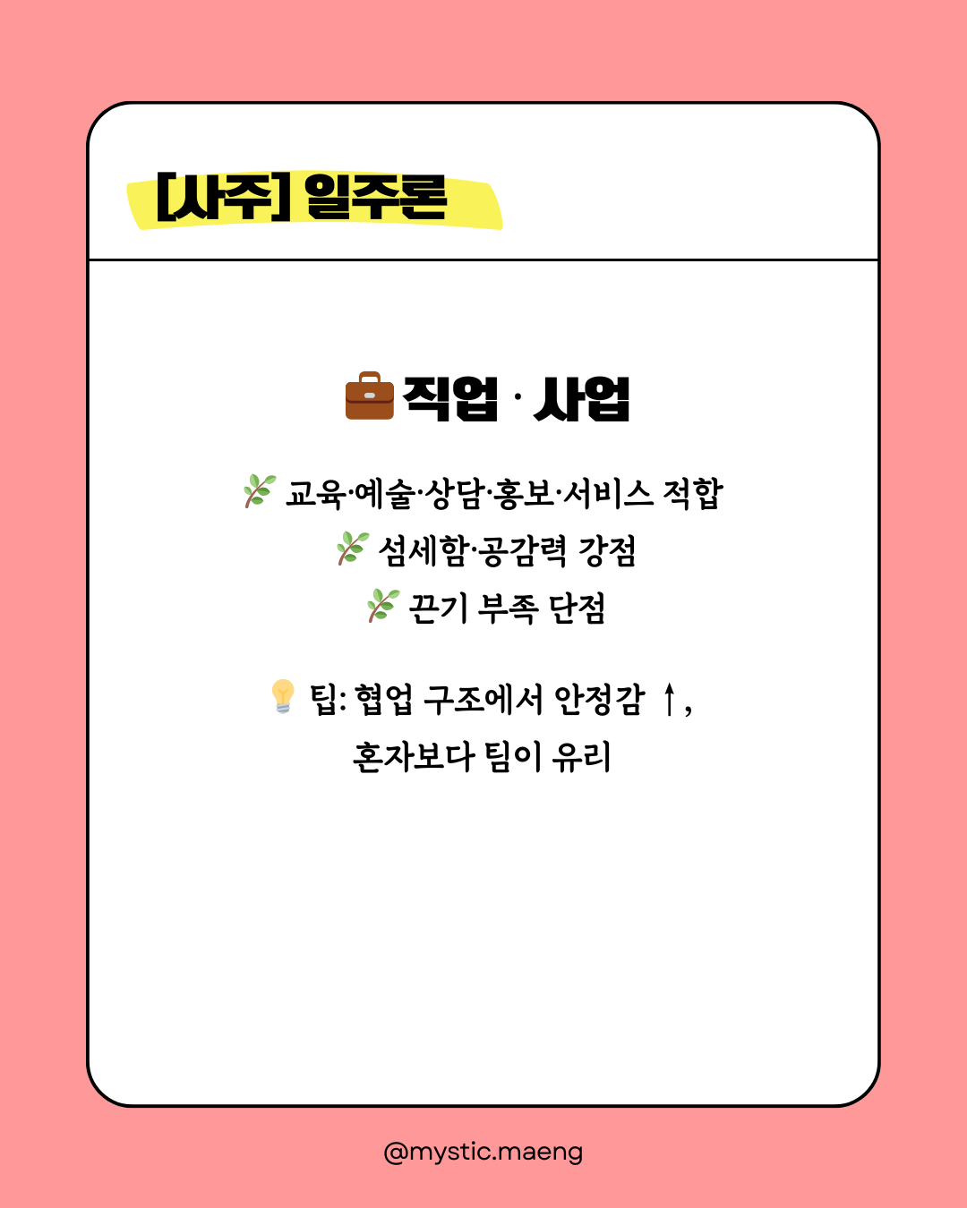 💡 직업 팁: 정사일주는 “사람과 함께하는 구조”가 안정감을 줍니다.