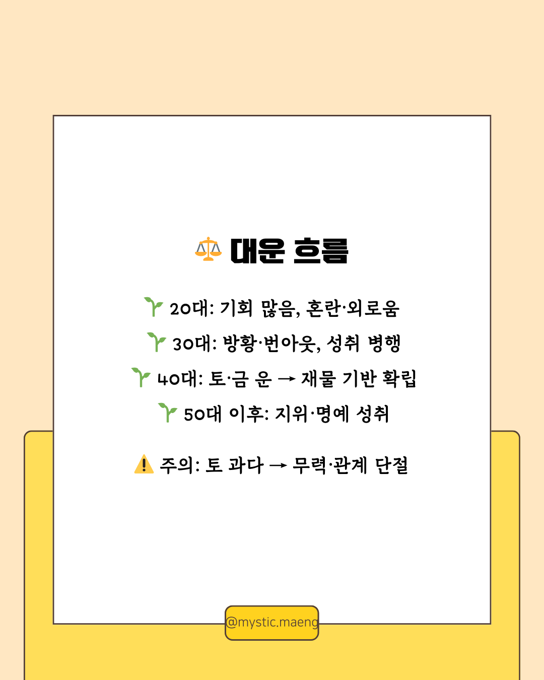 - 40대: 토(土)·금(金) 운 → 재물 기반 확립, 안정 기회