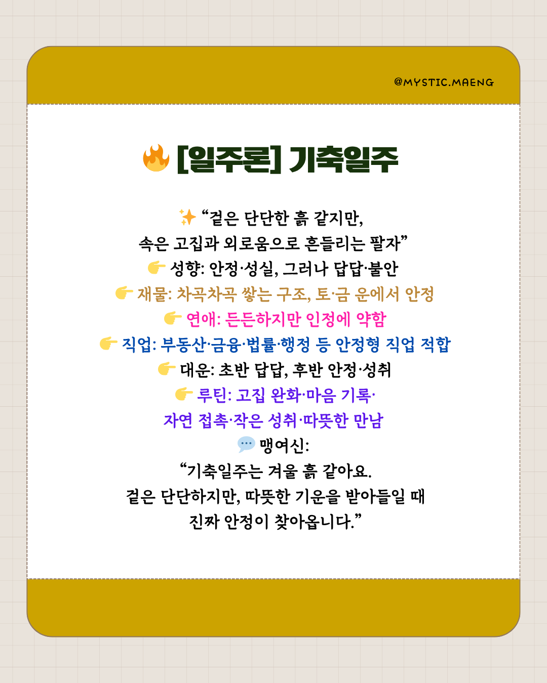💡 재물 팁: 기축일주는 저축·부동산·장기적 자산에 강합니다.