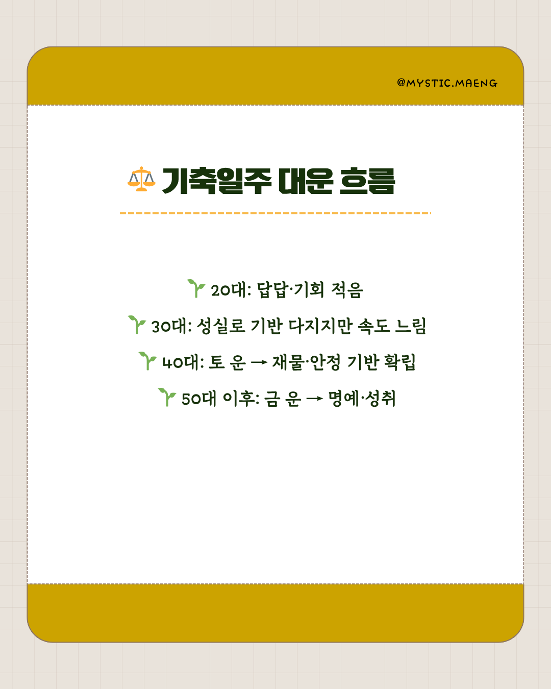 💡 대운 팁: 기축일주는 후반 안정형 팔자. 조급해하지 말고, 성실을 자산으로 삼으세요.