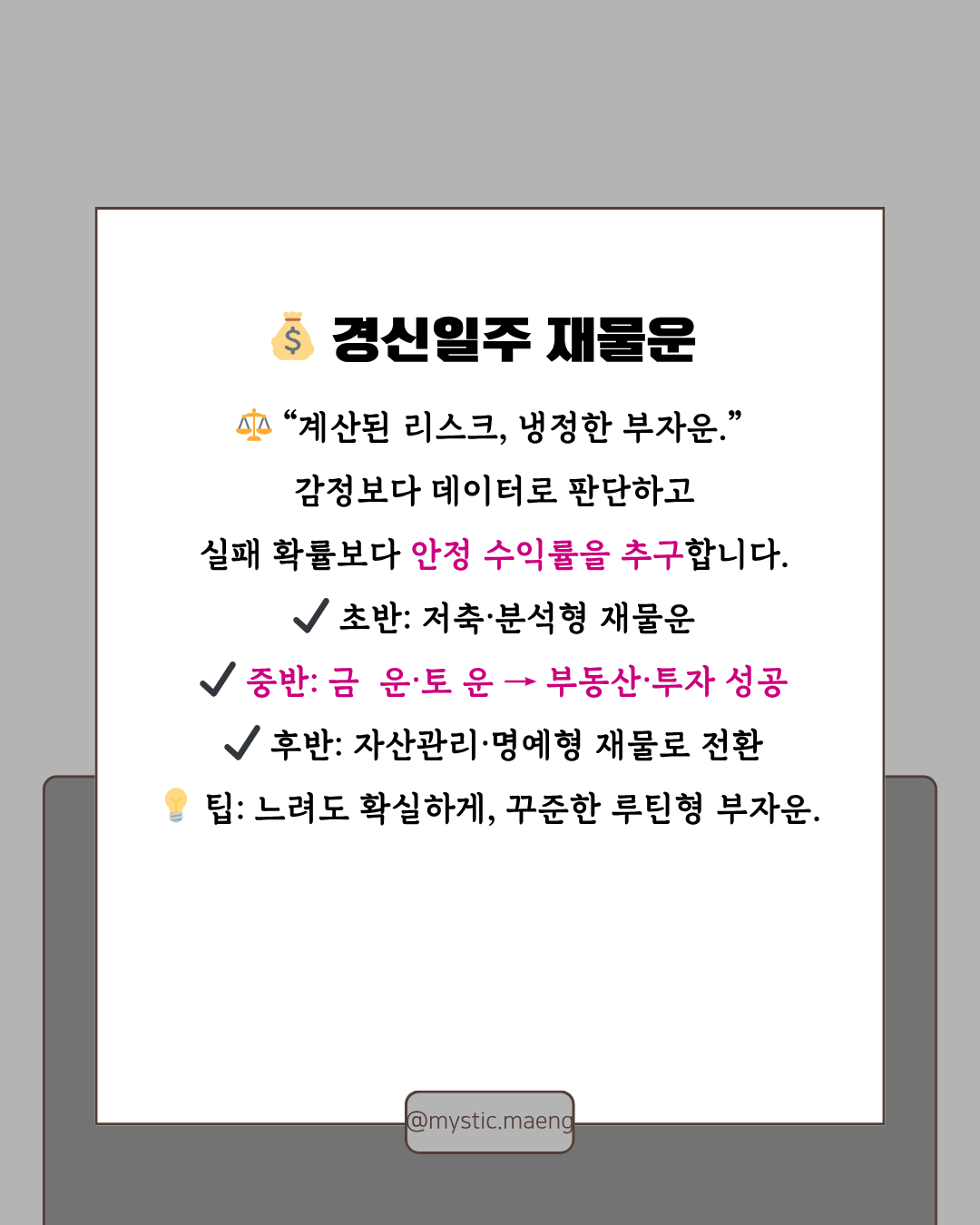 💰 재물운 – “냉정하게 벌고, 따뜻하게 쓰는 부자운”