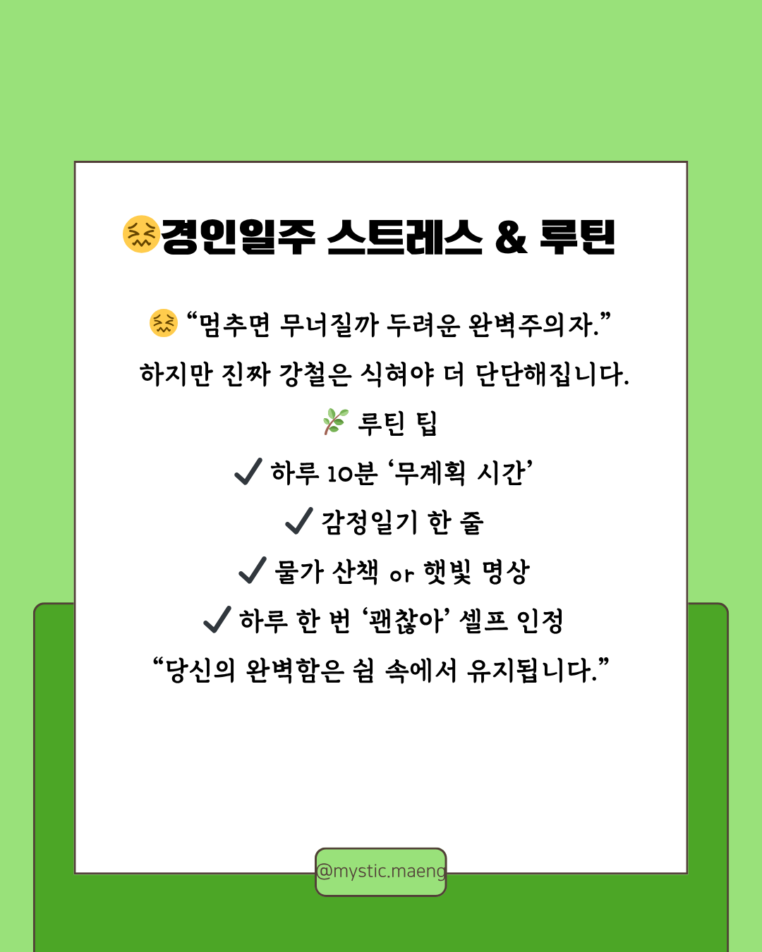 “경인일주의 칼날은 식혀야 더 단단해집니다. 당신의 완벽함은 쉼 속에서 유지돼요.”
