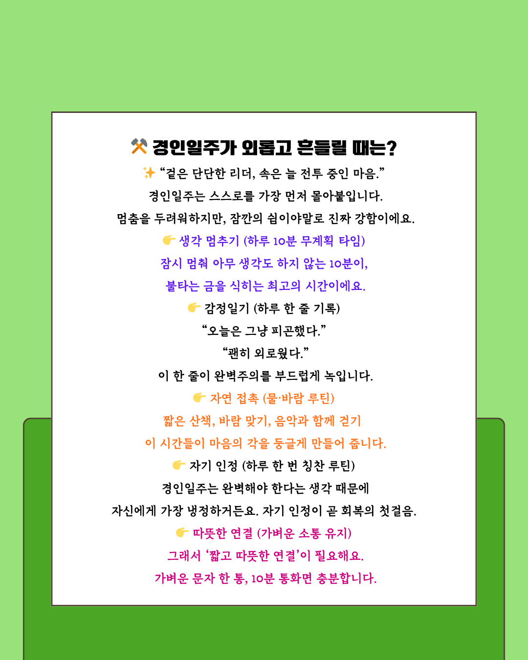 - 일 중심으로 살다 번아웃 오기 쉬움 → “1일 1멈춤” 필요