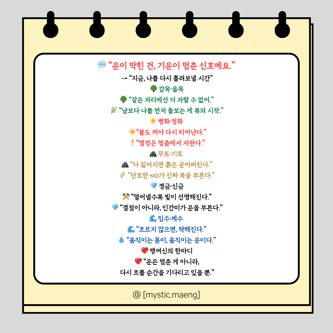 💬 막힌 신호: 몸이 피로하고, 말수가 줄고, 책임이 과중할 때.