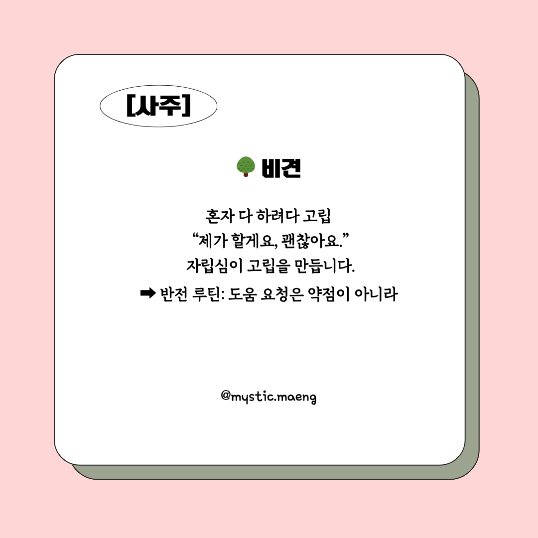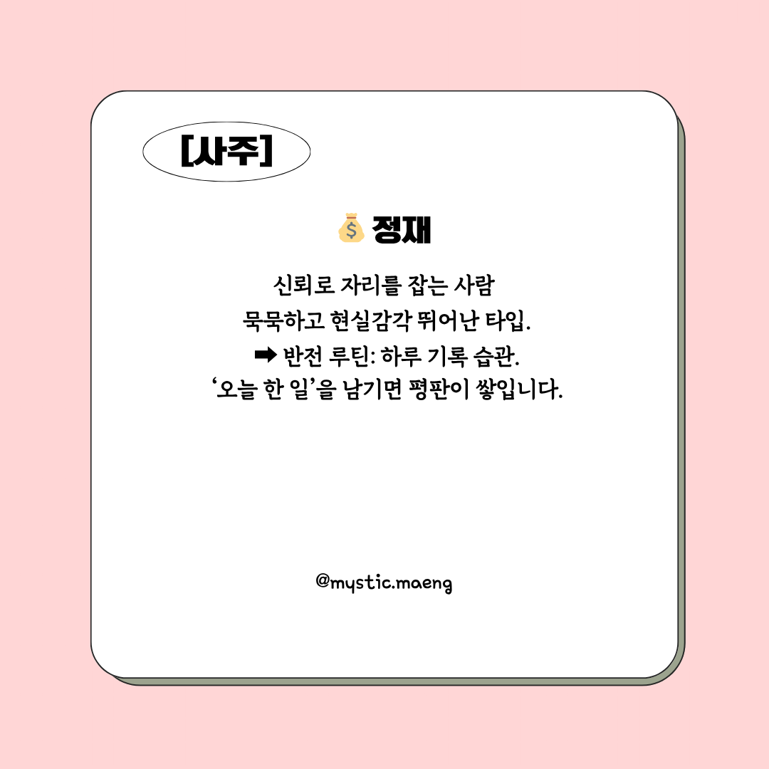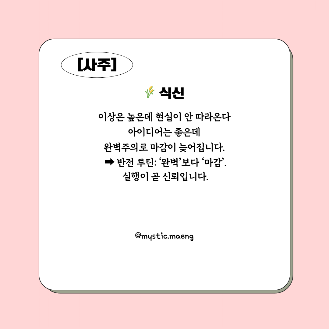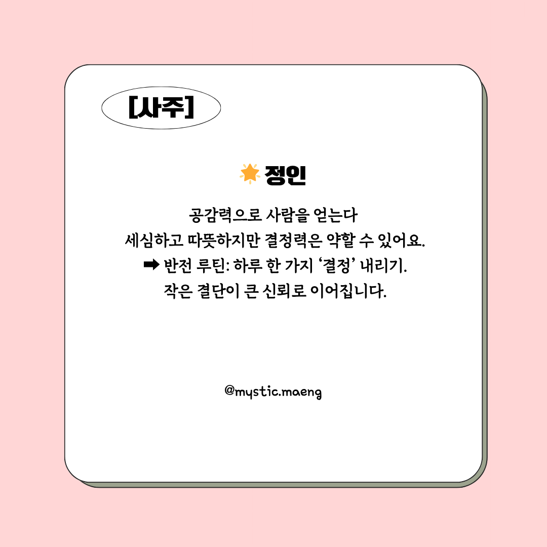 - 편인: 감성은 좋지만 실행력이 약함 → 아이디어에 ‘계획표’를 붙이기.