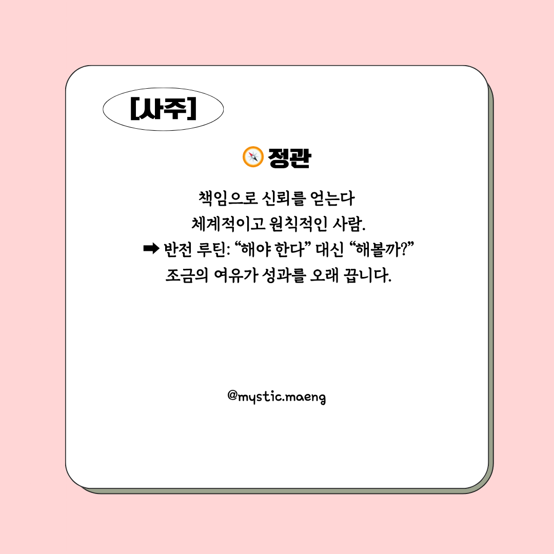 - 관성 강한 사람: 책임은 크지만 스트레스 과다 → 휴식도 업무의 일부로.