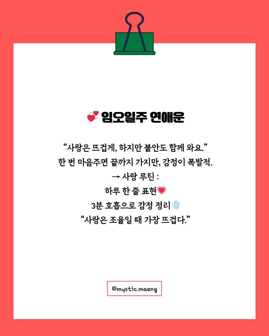 1️⃣ 연애운 – “사랑은 뜨겁게, 하지만 불안도 함께 와요”