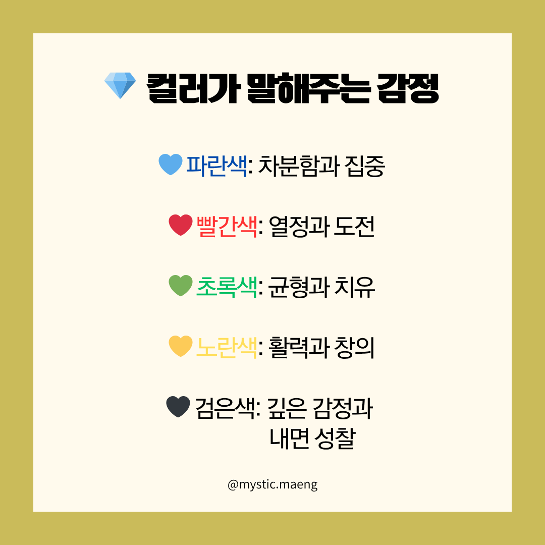 💛 노란색: 활력과 창의력을 불러일으켜, 마음을 여는 색이에요.