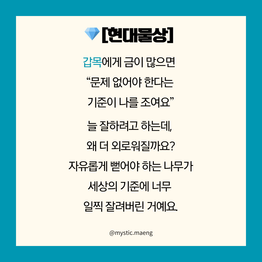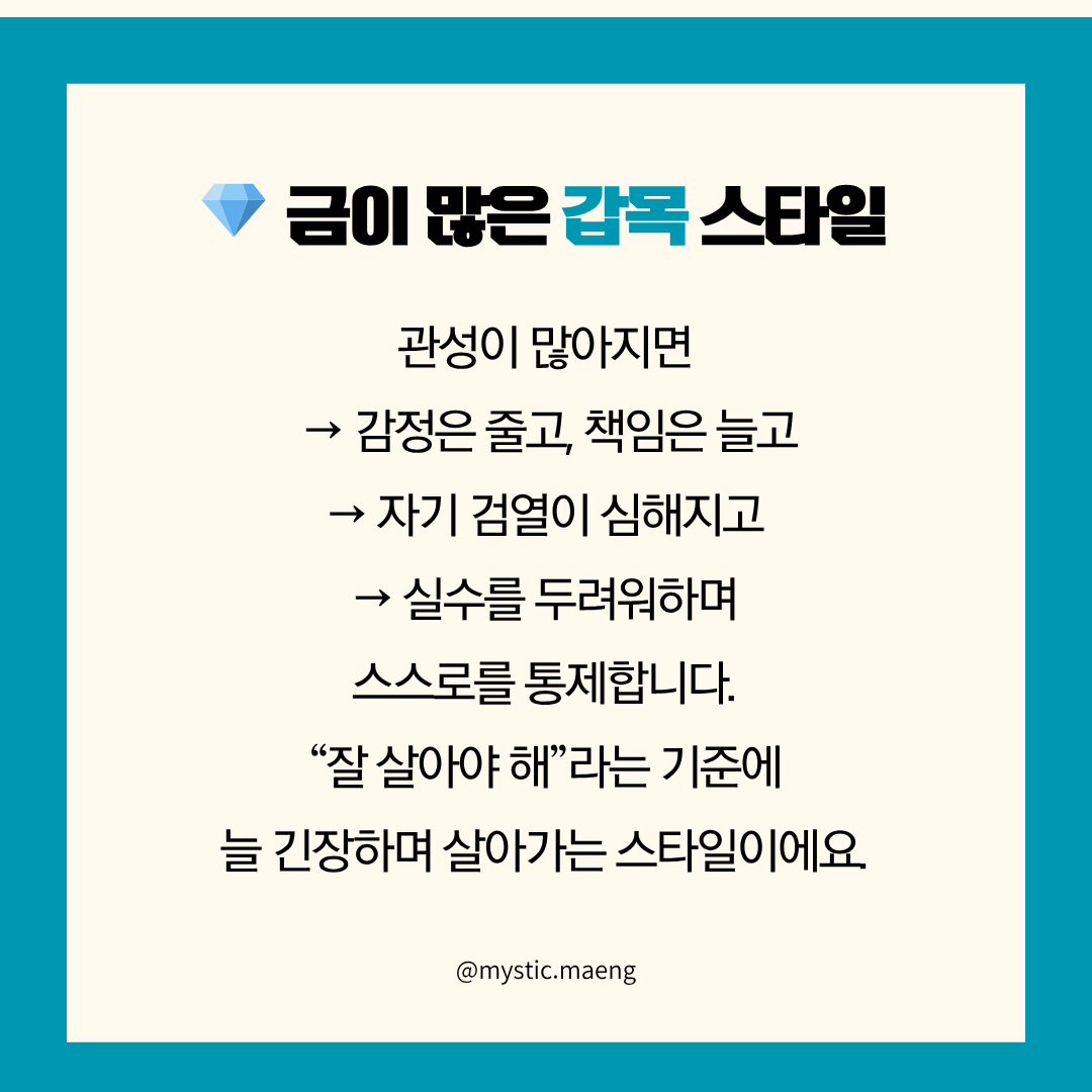 겉으로는 단단해 보이지만 속으론 늘 긴장된 상태. 자신도 모르게 “잘 살아야 한다”, “문제가