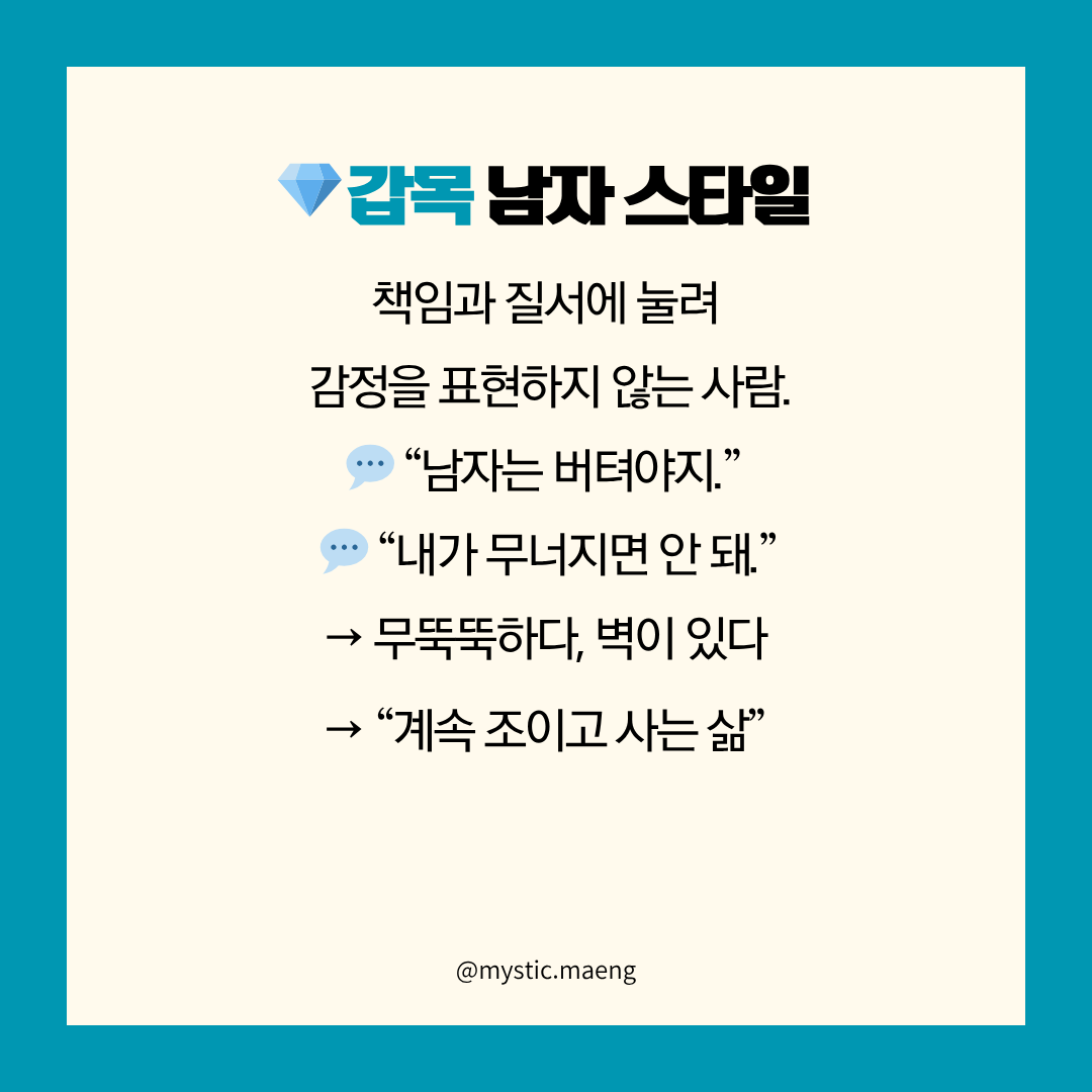 감정을 말하지 않고, 사랑도, 서운함도 표현 없이 삼켜버리는 타입이에요.