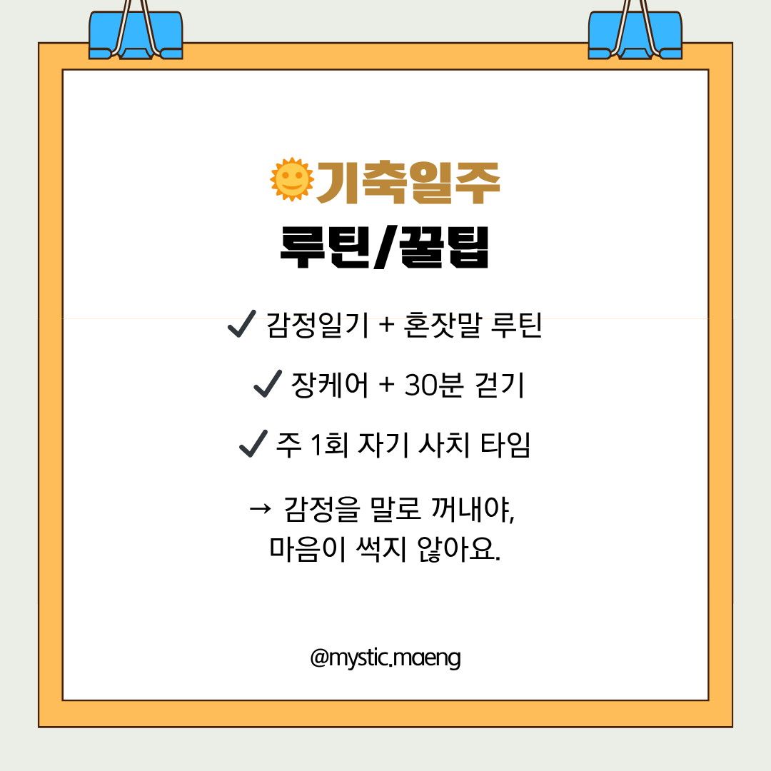 - 감정일기 루틴 → 하루 한 문장: “나는 지금 __이 힘들다.”