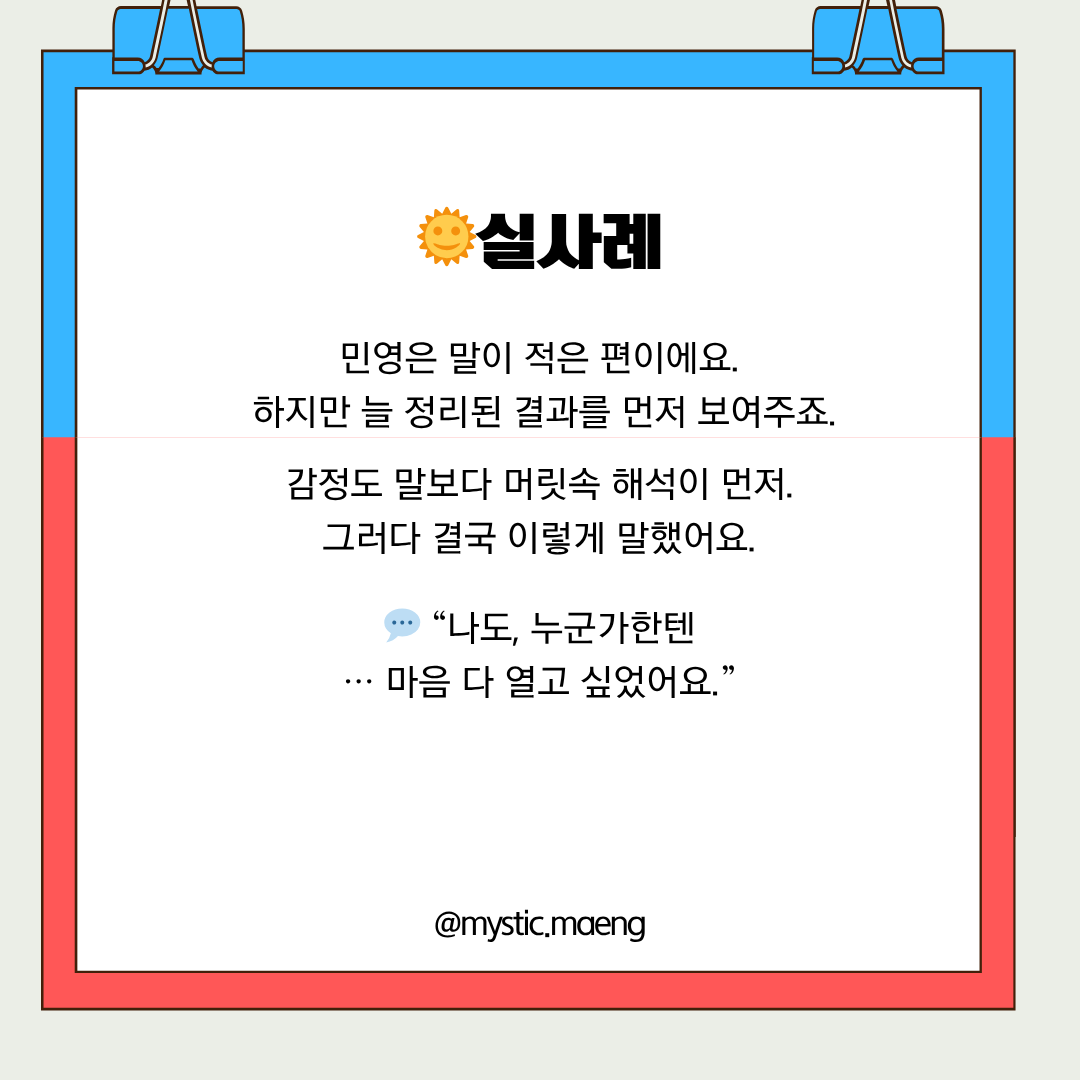 - 감정 표현은 서툴지만, 정이 깊고 은근히 배려심 많음